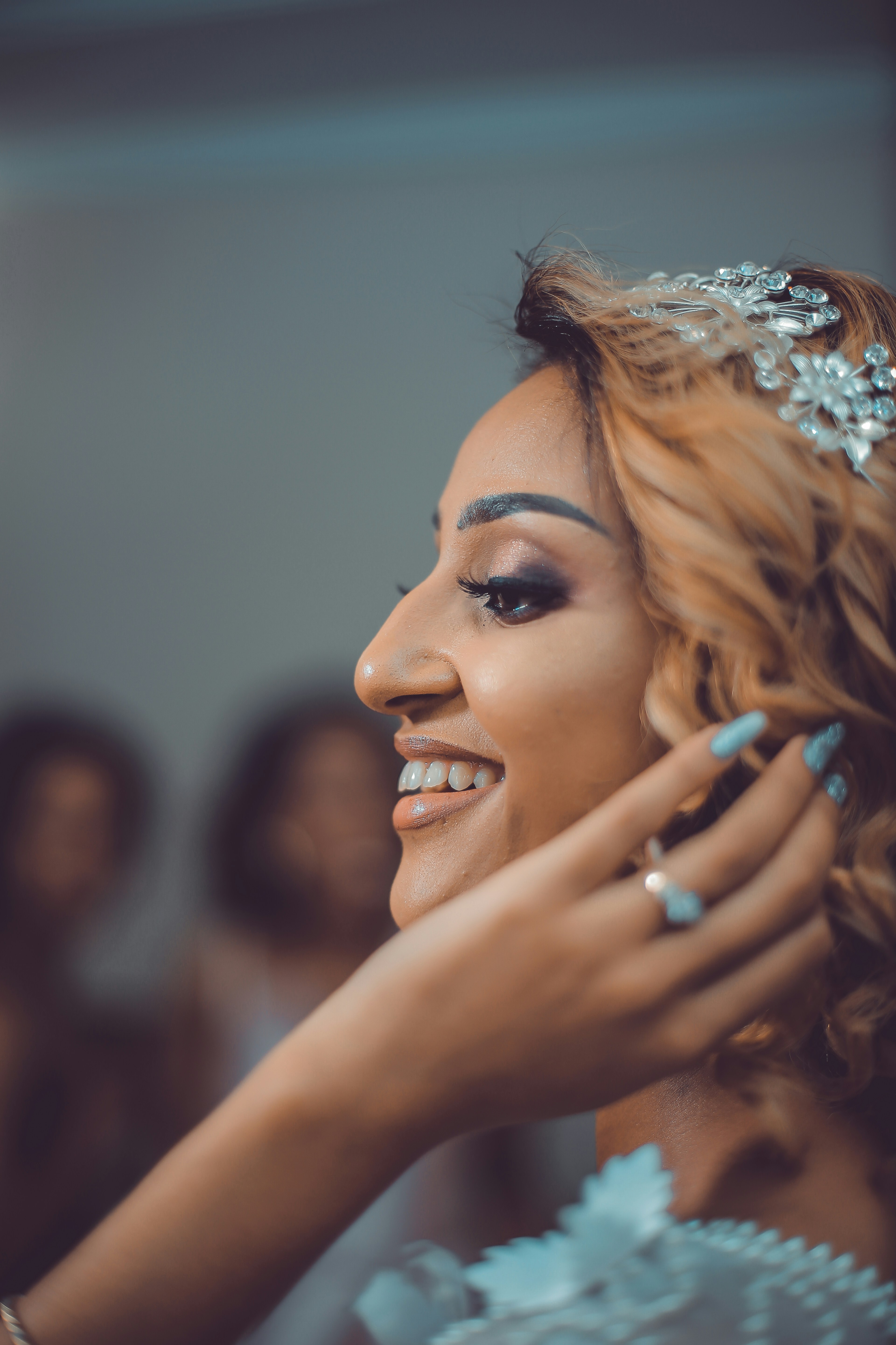 Woman Face Side View Bun Hair Fashion Model Beauty Makeup And Hairstyle Over Blue